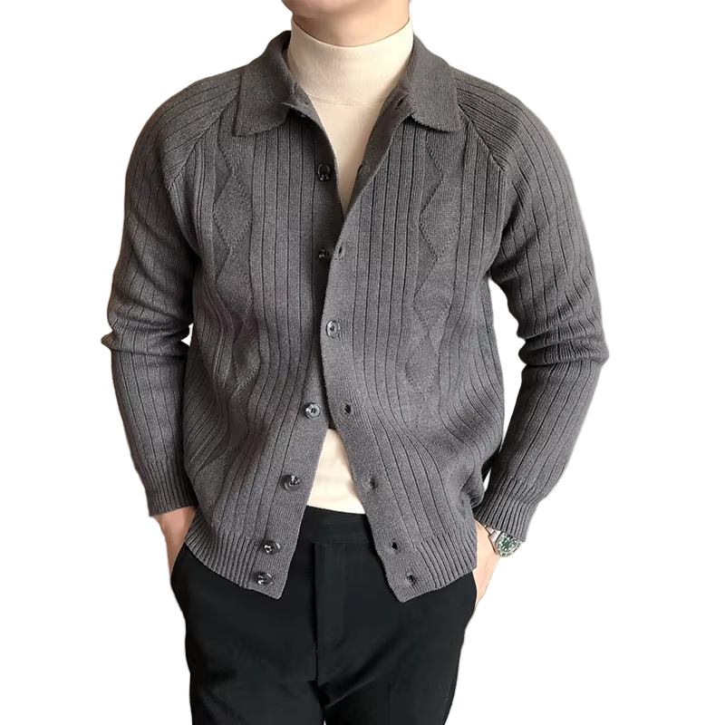 This men's cardigan features a vertical ribbed textured pattern. It has a collared neckline and a front button closure. The cardigan includes long sleeves that end with ribbed cuffs and a ribbed hem.