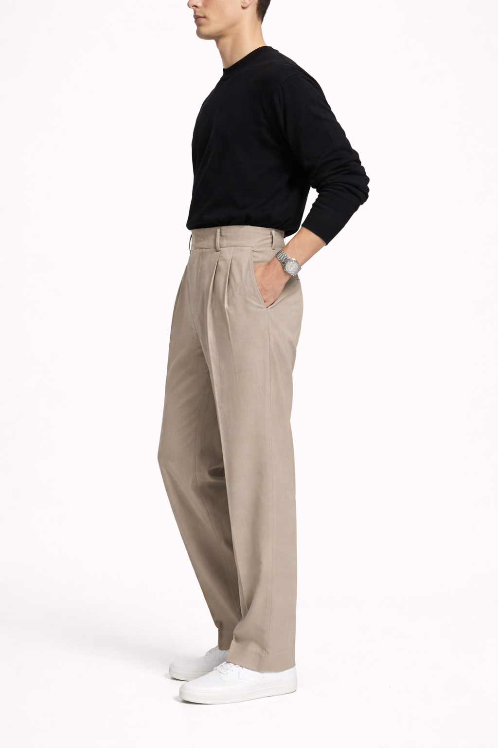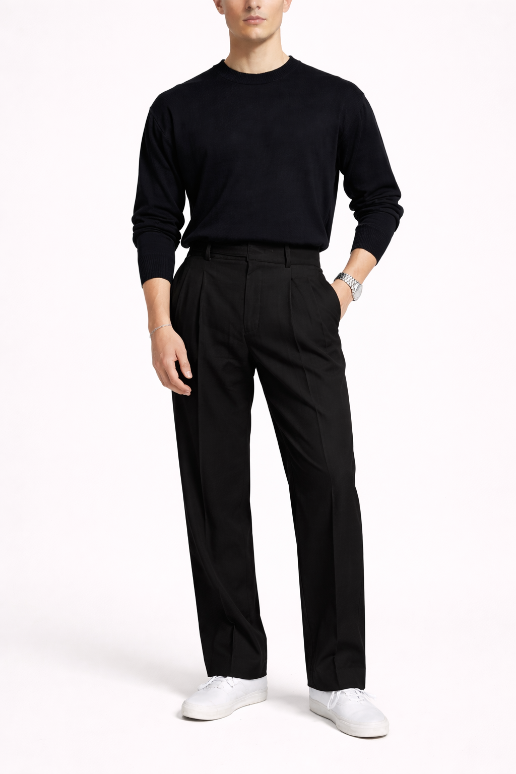 This men’s trousers has a high waist with a straight leg shape and a clean front style. The waistband includes belt loops and a defined front closure. The leg falls evenly from the hip to the hem, giving a balanced outline when worn. Designed for repeated wear, the trousers suit daily use and social occasions.